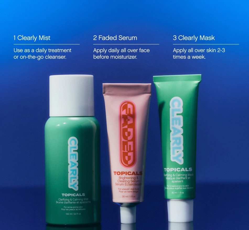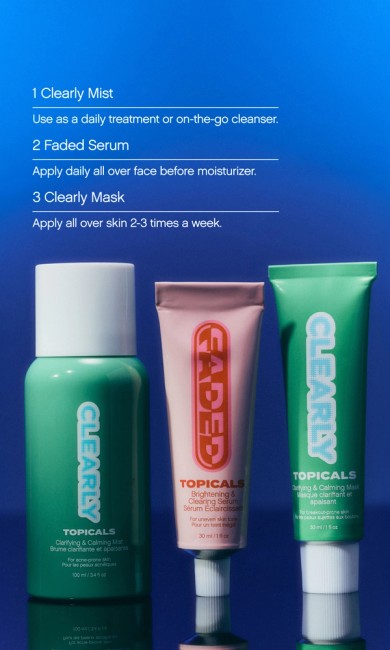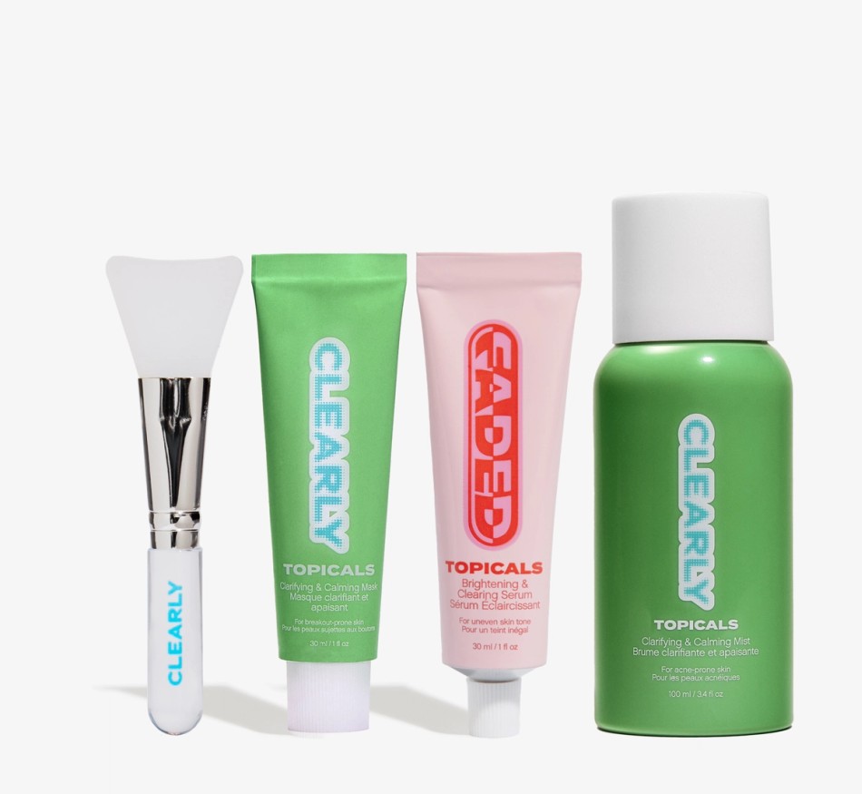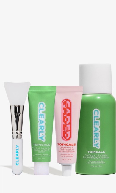 This limited-edition kit features all of Tiara's must-haves for breakout prevention, management, and post-inflammatory hyperpigmentation: Faded Serum, Clearly Mask, Clearly Mist, and a mask applicator brush.